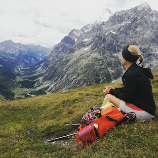 Mais uma voltinha, mais uma subida e encontrámos a melhor esplanada do percurso, a Maison Vieille. O nome é francês, mas estamos em Itália e a carta do ristorante do refúgio enche-nos as medidas. Pasta, pasta, pasta! Que rico almoço. Linda descida pelo bosque e eis que chegamos a Courmayeur, civilização a custo não suportável por portugueses, arregalamos os olhos, remexemos e vemos tudo o que não iremos comprar, mas trazemos connosco o buff do Tour do Mont Blanc para usar no último dia. Mas antes disso ainda faremos a magnífica subida ao Grand Col Ferret, onde Itália e Suíça se tocam. Esta subida-nunca-mais-acaba tira-nos o fôlego pela dureza e beleza. Para melhor chegarmos ao topo, o Rifuggio Elena reserva-nos o melhor chocolate quente, para depois, bastante tempo mas poucos quilómetros palmilhados depois, festejarmos a ascensão a mais um cume. O dia ainda não tinha terminado e a descida do Vale Ferret até La Fouly faz-nos não querer parar, por entre prado, single tracks rodeados de árvores e flores, de todas as cores. Uma delas, diz-nos o Gonçalo que nos guia desde o primeiro dia, chama-se "femme au réveille". Perguntei se era por ter um look despenteado. Acertei.